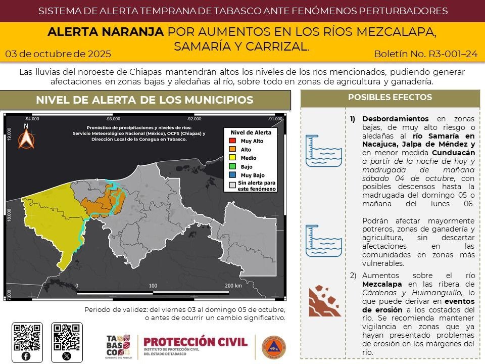 En el caso del río Samaría, el nivel podría superar su capacidad en zonas bajas de Nacajuca, Jalpa de Méndez y, en menor medida, Cunduacán, con mayor riesgo durante la noche del viernes 4 y madrugada del sábado 5 de octubre. Los descensos en los niveles podrían presentarse hasta la madrugada del domingo 6 o lunes 7 de octubre.