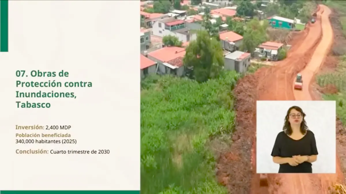 Uno de los ejes principales es el proyecto de protección contra inundaciones en Tabasco. El subdirector de Conagua, Felipe Zataráin, explicó que se están desarrollando 19 obras en la entidad con una inversión de 2 mil 400 millones de pesos. Estas intervenciones buscan resguardar a la población de una de las zonas más vulnerables del país frente a inundaciones.