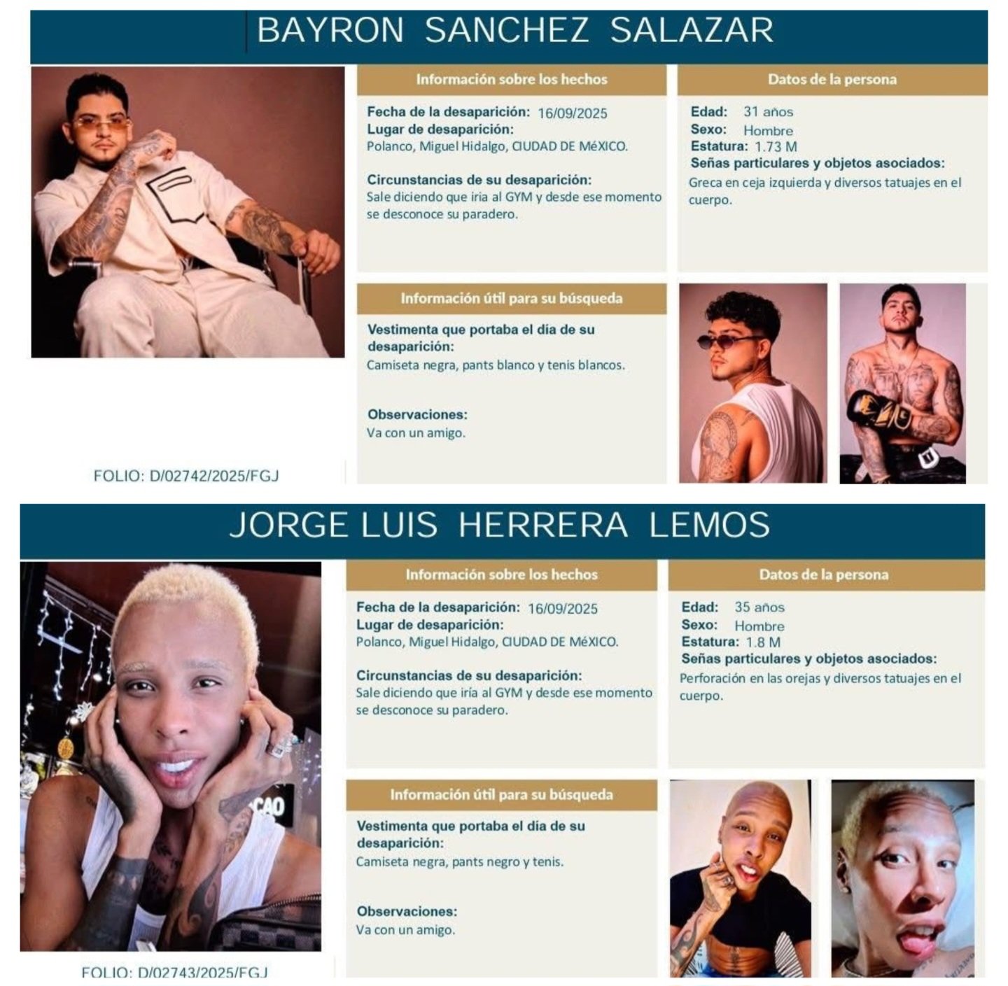 De acuerdo con los primeros reportes, los artistas fueron vistos por última vez en la colonia Polanco, en la alcaldía Miguel Hidalgo, donde presuntamente se dirigían a un gimnasio. Días después, sus fichas de búsqueda fueron difundidas por la Comisión de Búsqueda de Personas de la capital.