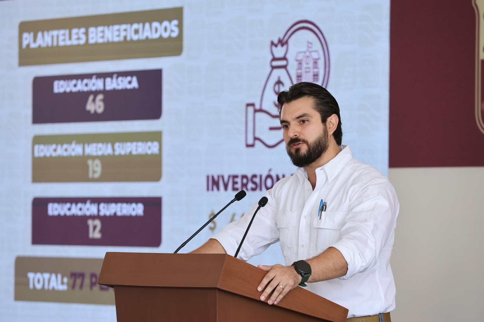 En conferencia realizada en Palacio de Gobierno, el director de Programas de Inversión en Infraestructura Educativa de la Setab, Rashid Valdez Dagdug, explicó que la estrategia incluye la gestión de diversas fuentes de financiamiento para mejorar las condiciones de aprendizaje en 77 planteles. De estos, 46 corresponden a educación básica, 19 a media superior y 12 a educación superior.